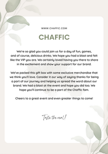 In addition to the booklet, my team and I also approached and invited a number of Key Opinion Leaders (KOLs) and micro-influencers to the grand opening event. For this event, we provided them with a PR Package that contains our signature merchandise, limited-edition gifts and the following Greetings Card. Similar to the booklet, these cards also serve as an educational tool to spread awareness of the Chaffic brand, which were just established in Singapore then.